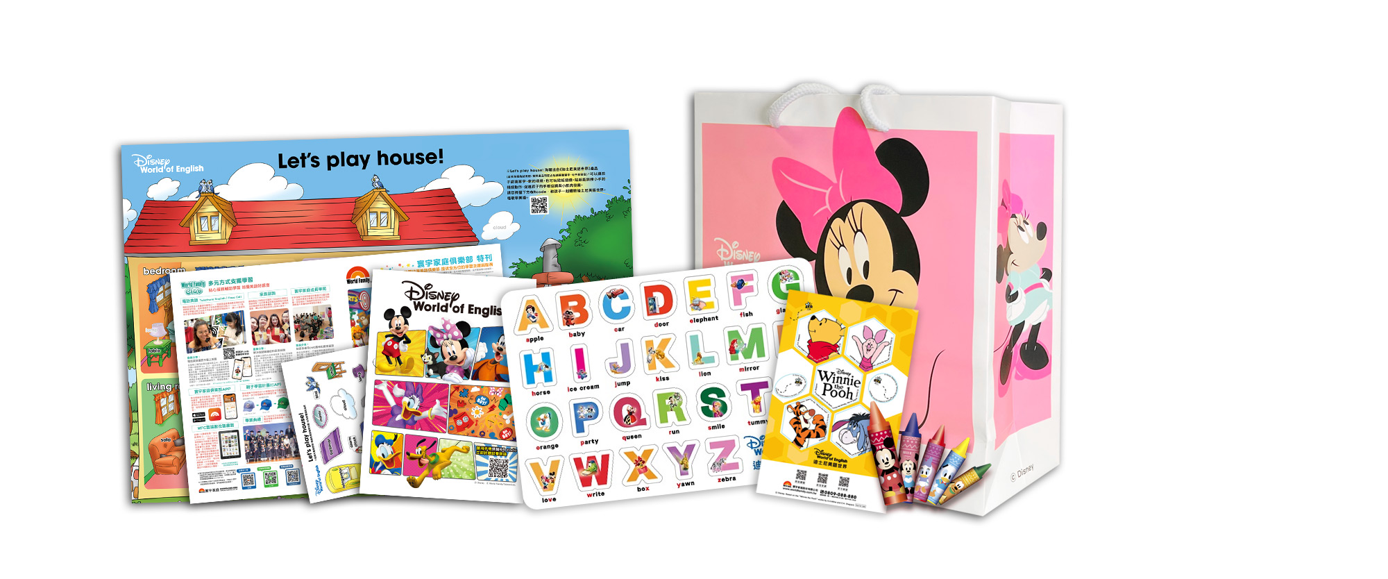 米奇美語體驗包 / 迪士尼人物5色蠟筆 / ABC字母拼拼磁鐵組 / 維尼的蜂蜜時光貼紙 / 米奇米妮提袋 / 展覽特刊